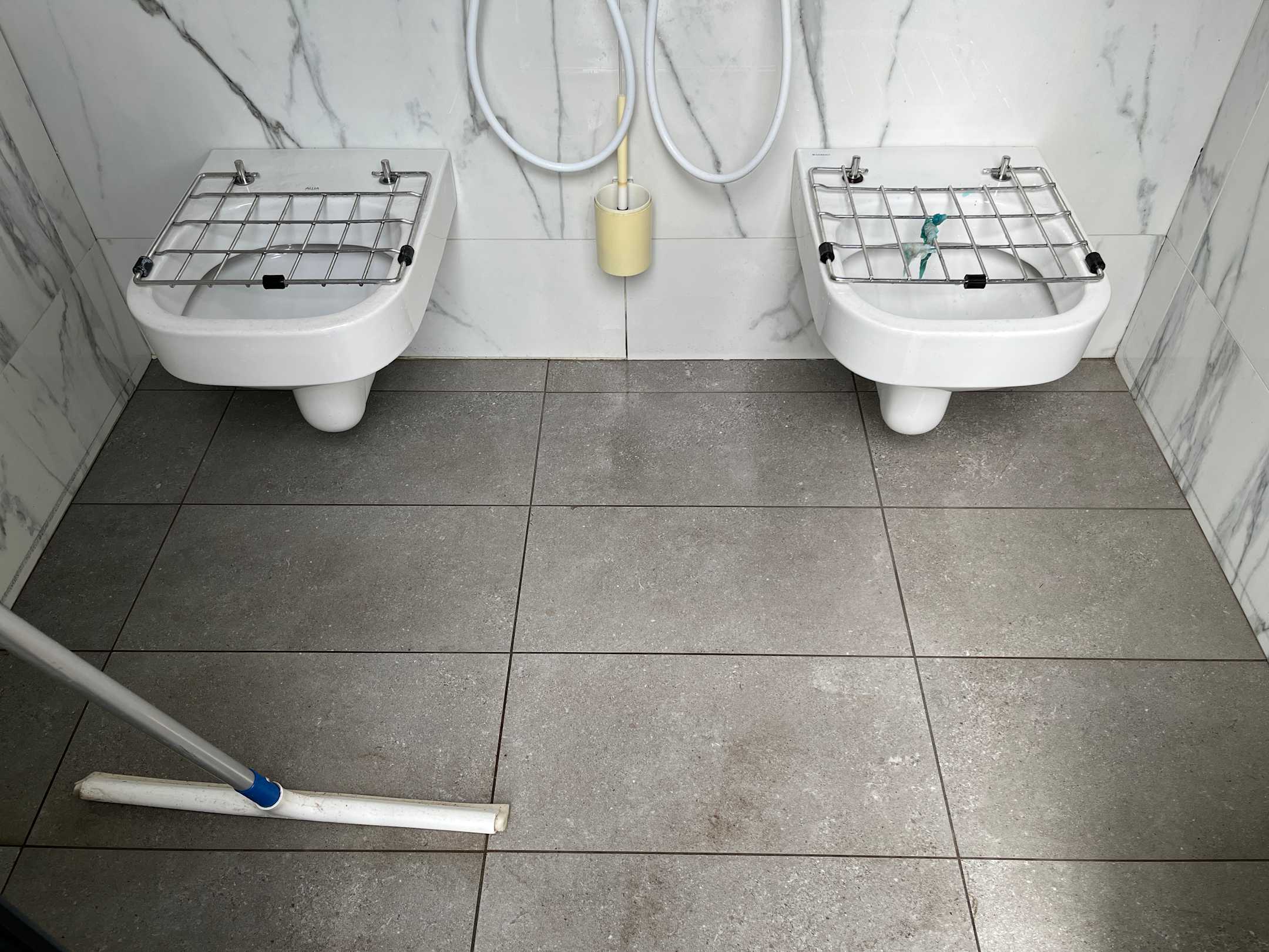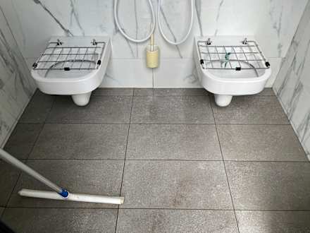 Entleerung der Chemietoilette ohne Bodenabfluss. Es steht die Brühe und beim Reinigen wird es einfach auf die Wege verteilt. Kein Waschbecken vorhanden, um die Hände zu reinigen.