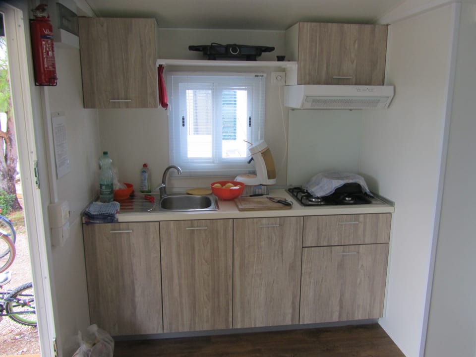 ZimmerKüchenzeile mit Spüle und Gasherd. Achtung: Der Tischgrill oben und die Pad-Kaffeemaschine sind NICHT von der Anlage zur Verfügung gestellt!