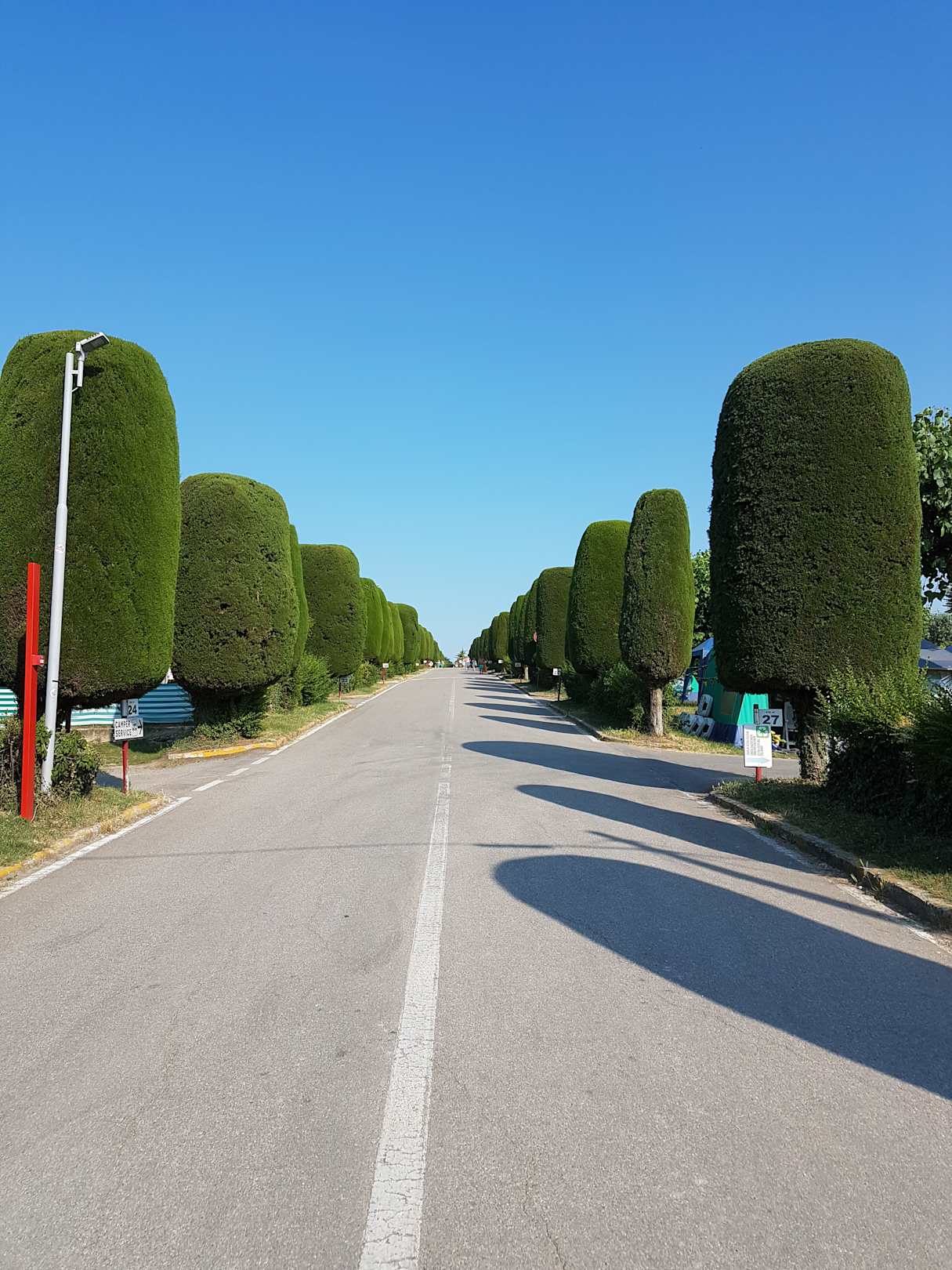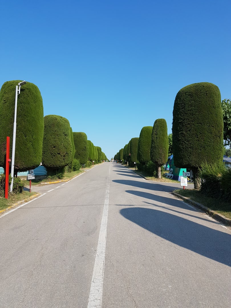 Steile Strasse durch den Camping aber zu Fuss und Velo gut machbar. Die geht von der Reception bis zur Kreuzung wo der Markt und Restaurant ist und natürlich zum See gelangt man auch. Am Tag sehr stark mit Fussgänger (Camper) gebraucht.