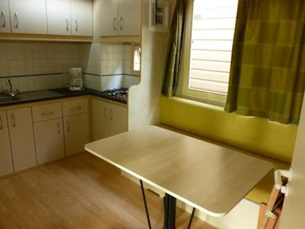 Die Küche mit EssbereichKüche mit Gasherd, Kaffeemaschine, Mikrowelle, großem Kühlschrank.