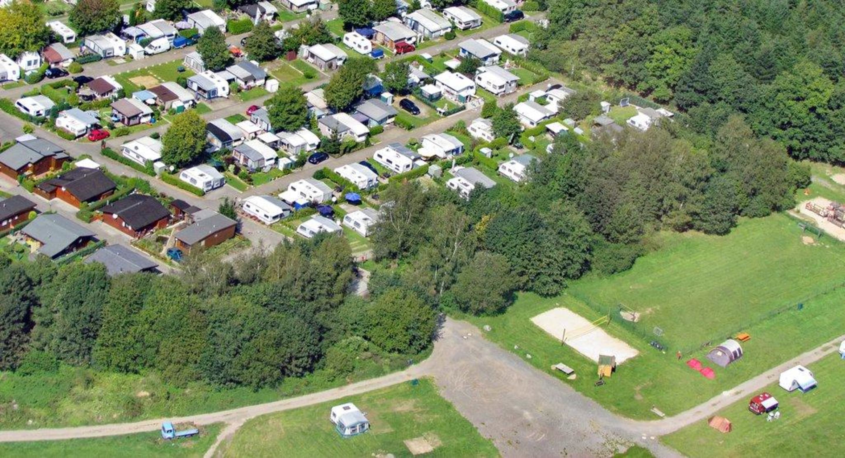 Unten rechts der Volley-/Fußballplatz; rechts aussen sieht man einen Teil des Spielplatzes. Hinter dem Volleyballplatz, direkt in der ersten Reihe hinter den Bäumen, stehen links aussen die Mietcampingwagen 4001 + 4002.