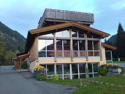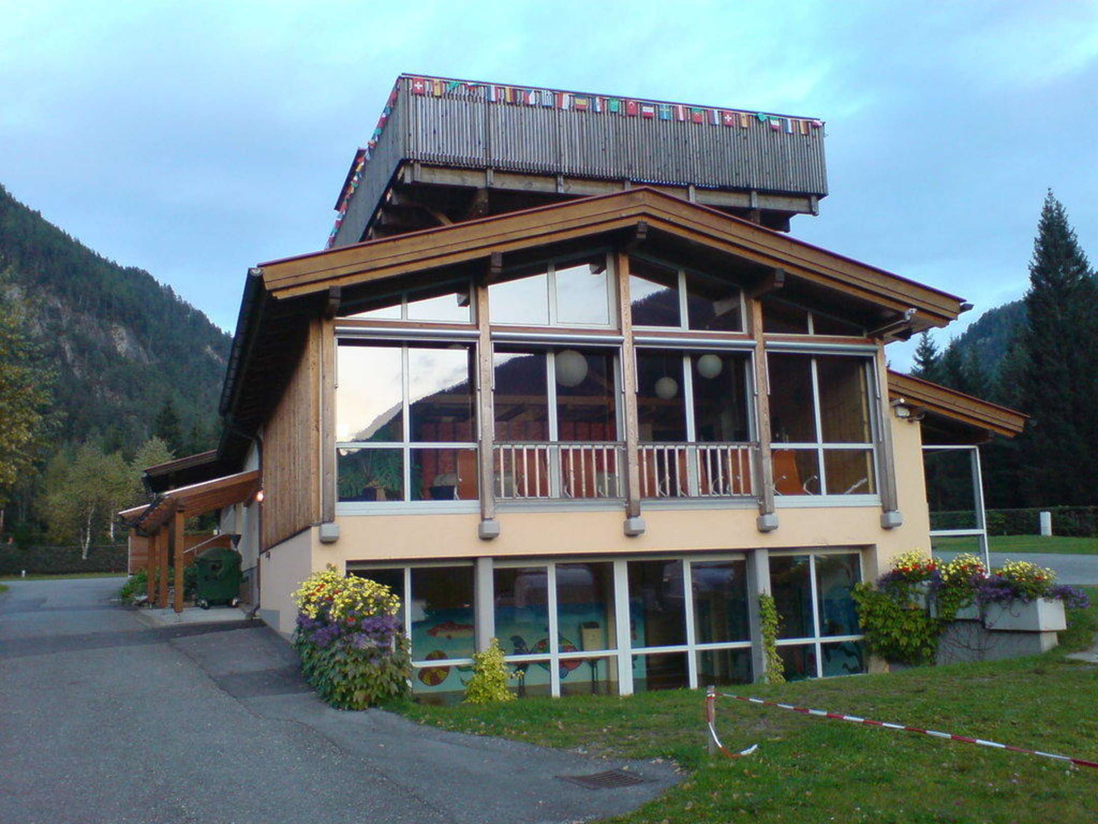 Hinter diesen großen Panoramafenstern befindet sich der Wellnessbereich. Dahinter kann man entpannen und den Ausblick genießen.