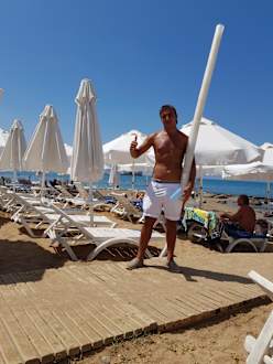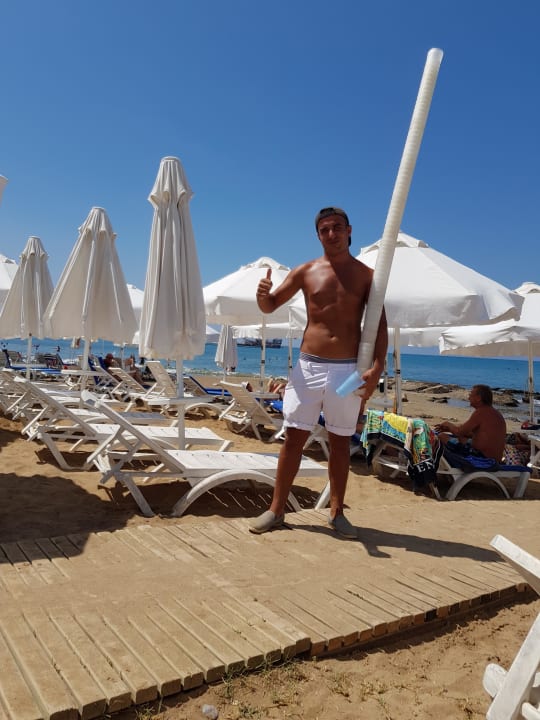 Sehr sehr fleißig und trotz Streß immer nett :) Erst hat der Kellner die Getränke am Strand verteilt, dann sammelt er die hochwertigen Kunststoffbecher wieder ein.