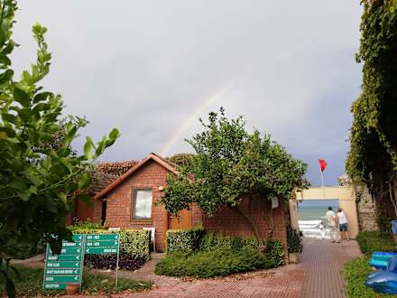 Blick zum Strandausgang mit Regenbogen nach dem Sturm.