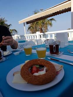 Frühstück auf der Restaurantterrasse am Meer.