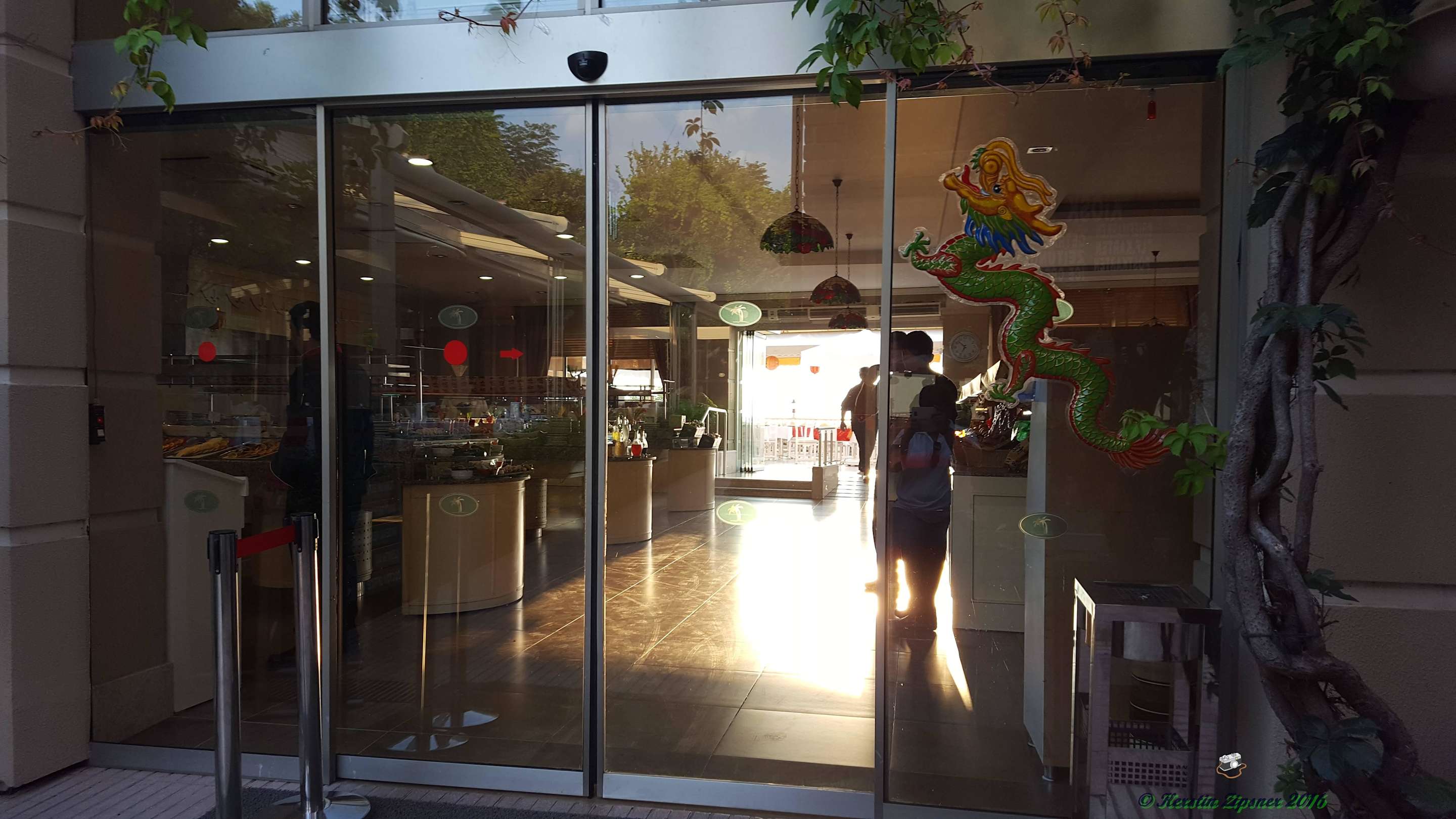 Eingangstüre zum Hauptrestaurant und zur Aussenterrasse mit demBlick auf das Meer