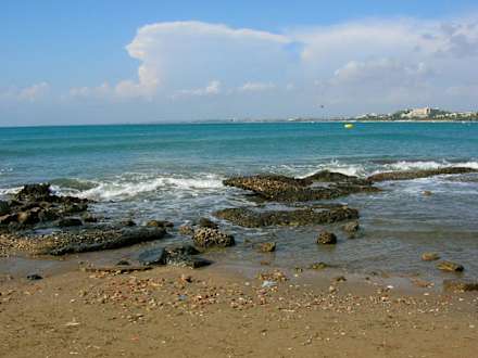 Ruinen ragen aus dem MeerVon hier aus nach links und man hat schönen Sandstrand und man kann ohne sich die Beine zu brechen ins Meer.