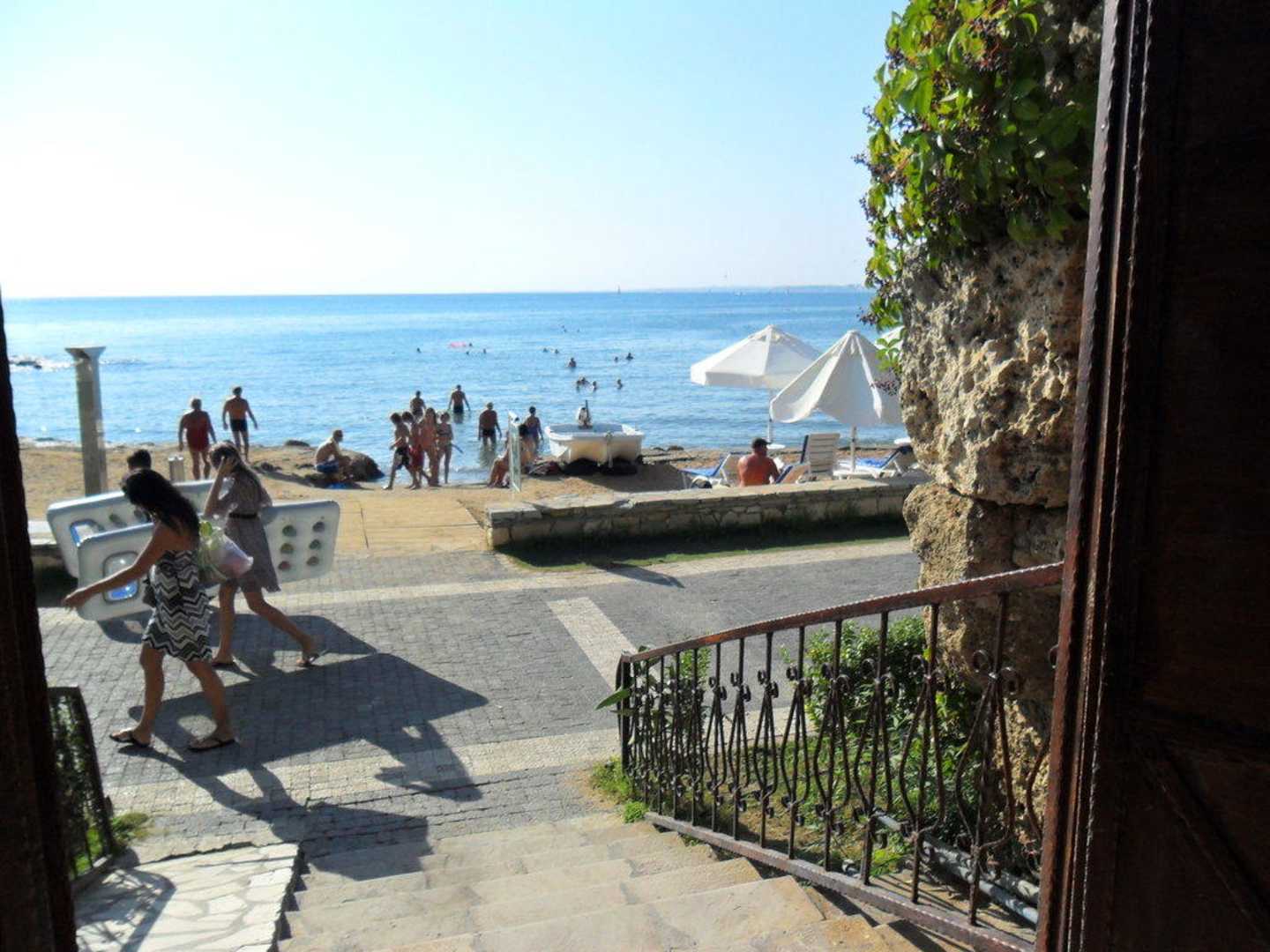 Blick aus der Hotelanlage heraus, direkt zum Strand geht es gerade aus. Ausreichend Sonnenstühle und Liegen sind vorhanden. Nach rechts und links kann man gut am Strand spazieren gehen (Strandpromenade).