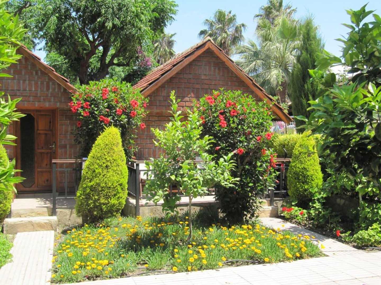 vor jedem Bungalow wachsen wunderschöne Pflanzen.