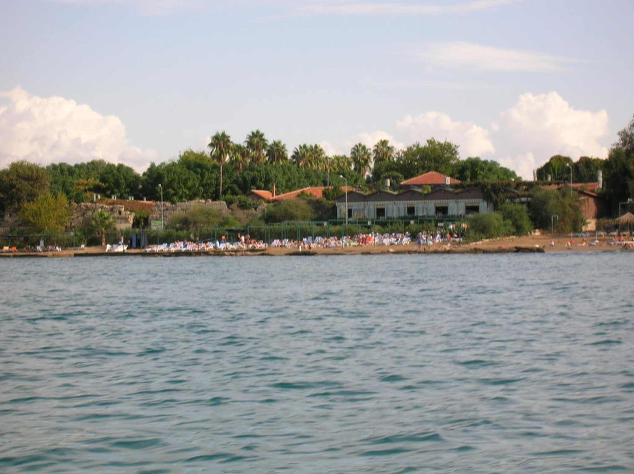 Strand und Hauptrestaurant (Gebäude mit großer Panoramafensterfront) vom Meer ausgesehen. Die Anlage ist in die alte Stadtmauer von Side eingebaut worden.
