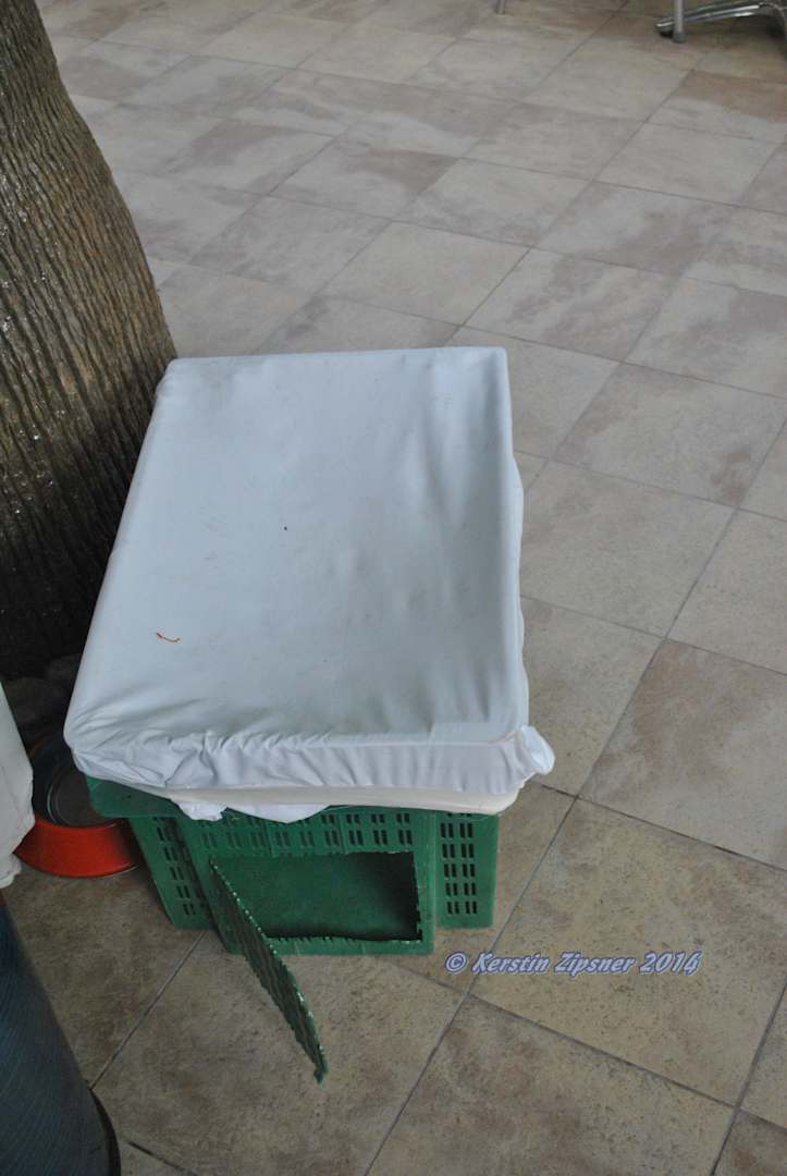 Dieser Katzenfangkorb stand zu jeder Essenzeit an der Poolbar. Die Katzen wurden mittags mit frischem Fleisch angelockt, gefangen und dann abtransportiert.