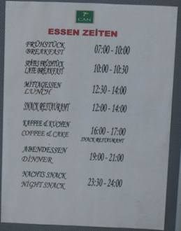 Öffnungszeiten der zahlreichen Restaurants. Man hat ausgiebig Zeit und muss nicht hetzen beim Essen. Auch mehr als 2 Stunden !!! Die Al-A-Cart-Restaurants haben ca. 2 - 2 1/2 Std. geöffnet, also ausgiebig Zeit zum Essen und trinken.