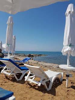 Sandiger Hotelstrand. Im Wasser etliche Steine. Badeschuhe unbedingt zu empfehlen.