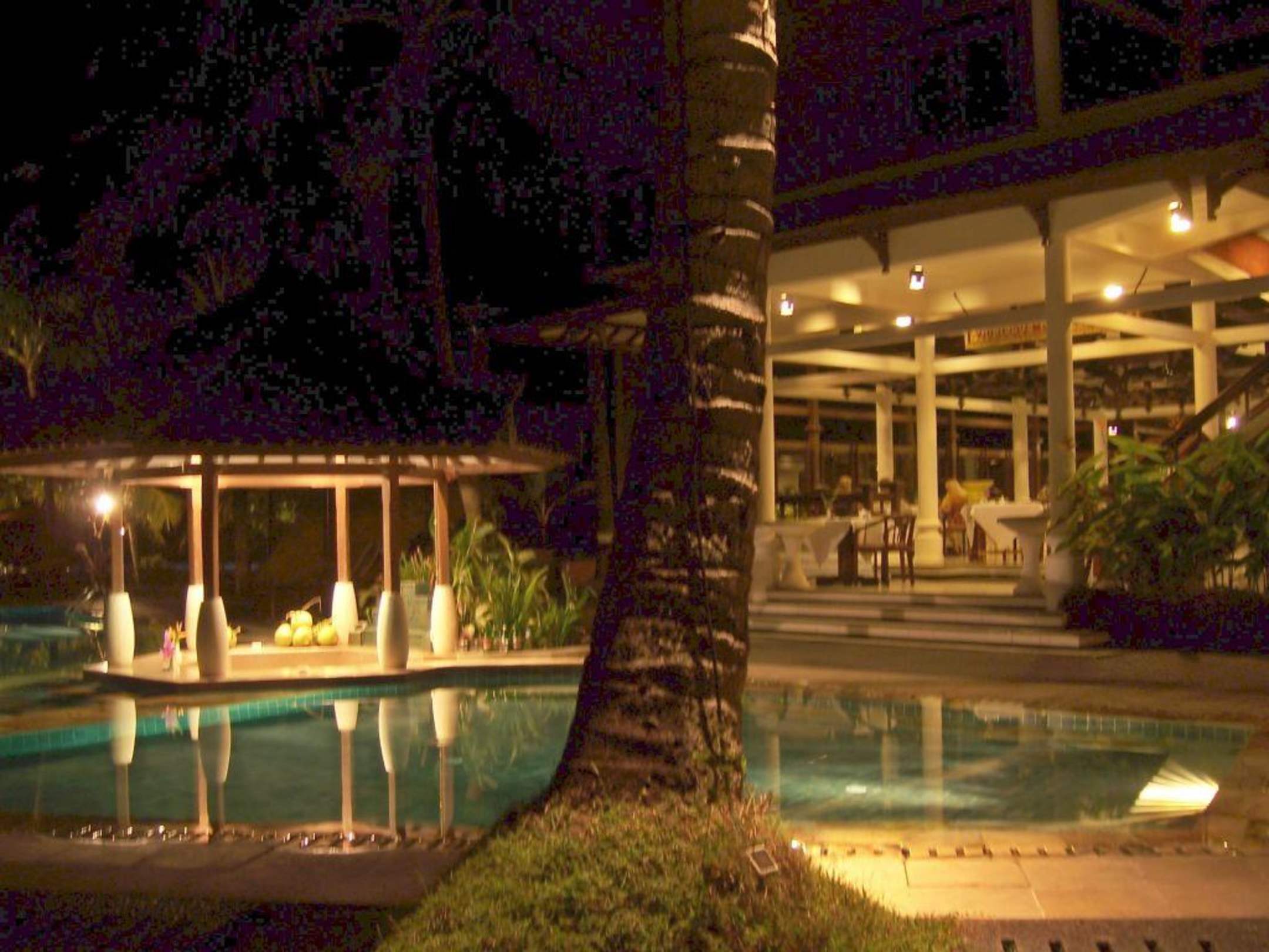 romantische Abenbeleuchtung der poolbar (im Hintergrund das Restaurant)