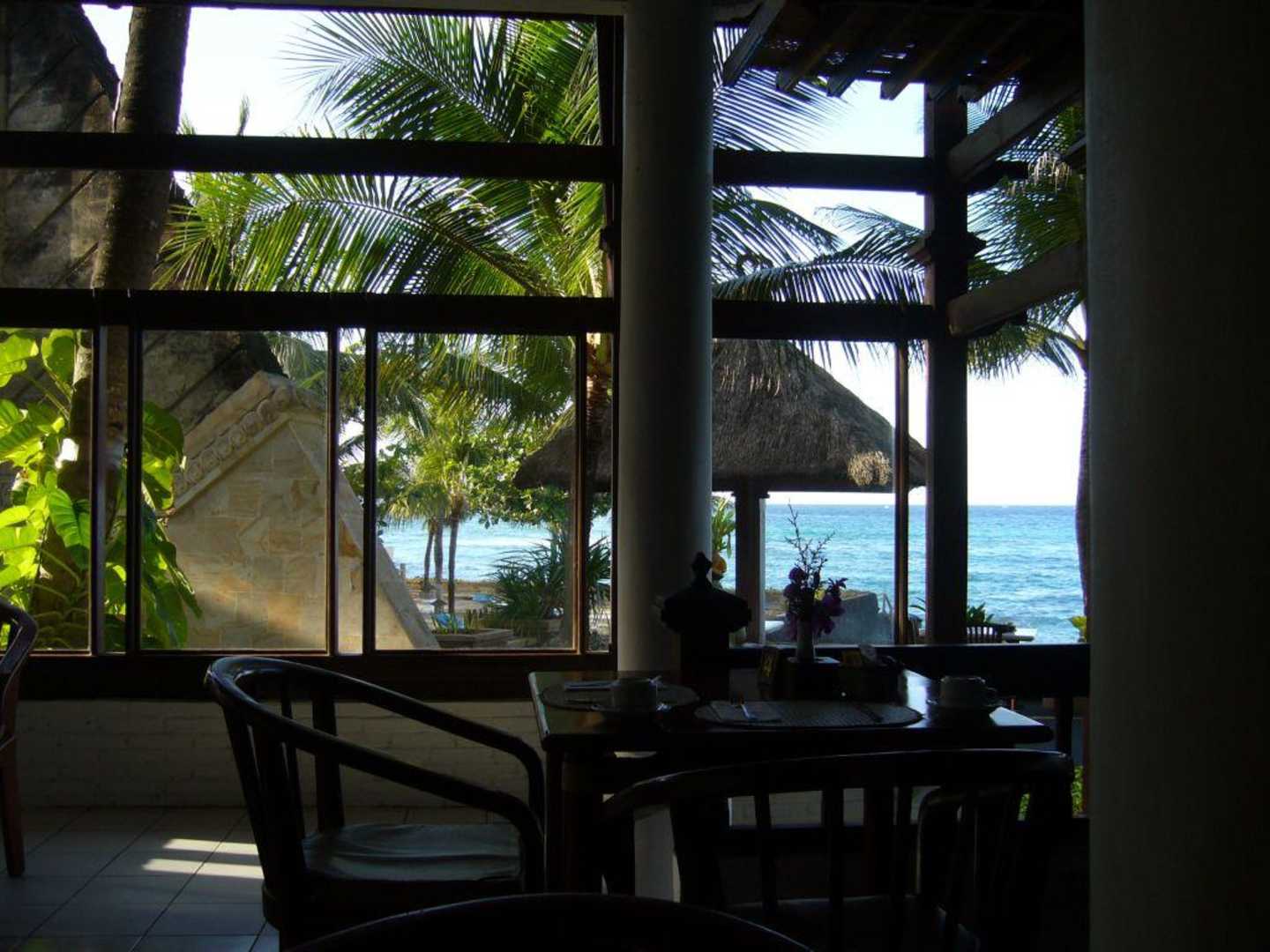 Blick aus dem Restaurant des Hotels Candi Beach Cottages auf das Meer