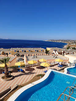 AusblickSicht aus unserem Zimmer (eig. Zugang zum Sharingpool + Meerblick) - kleine Liegeterasse hinter der 2.Reihe Sharingpool