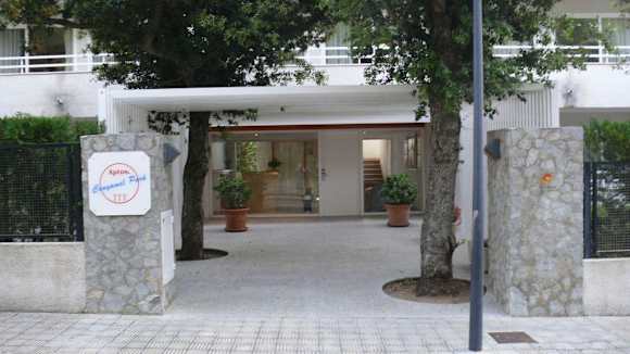 Eingang des Apartmenthauses, direkt davor findet man Parkplätze für den Mietwagen. Innen findet man die div. Mappen der Reiseveranstalter