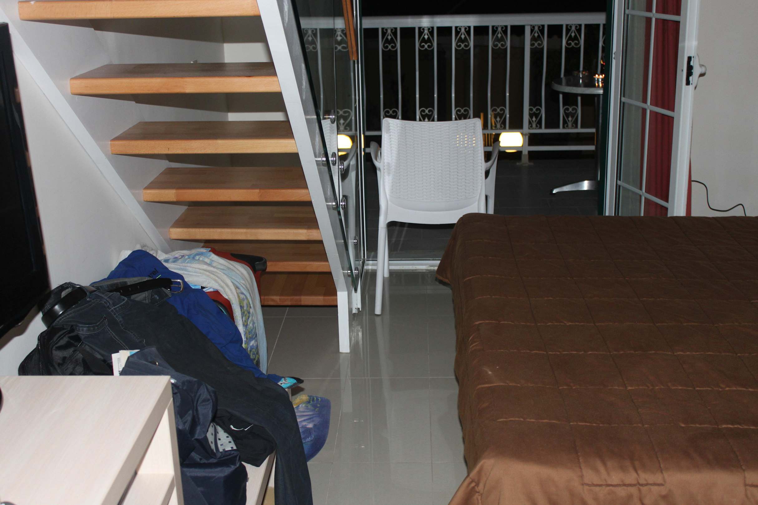 Zwischen Treppe zum oberen Teil des Zimmers und Bett rund 40 cm Platz. Aufrecht gerade durchgehen praktisch nicht möglich. Sehr eng und klein für 4-Sterne Qualität und das für 2 Wochen.