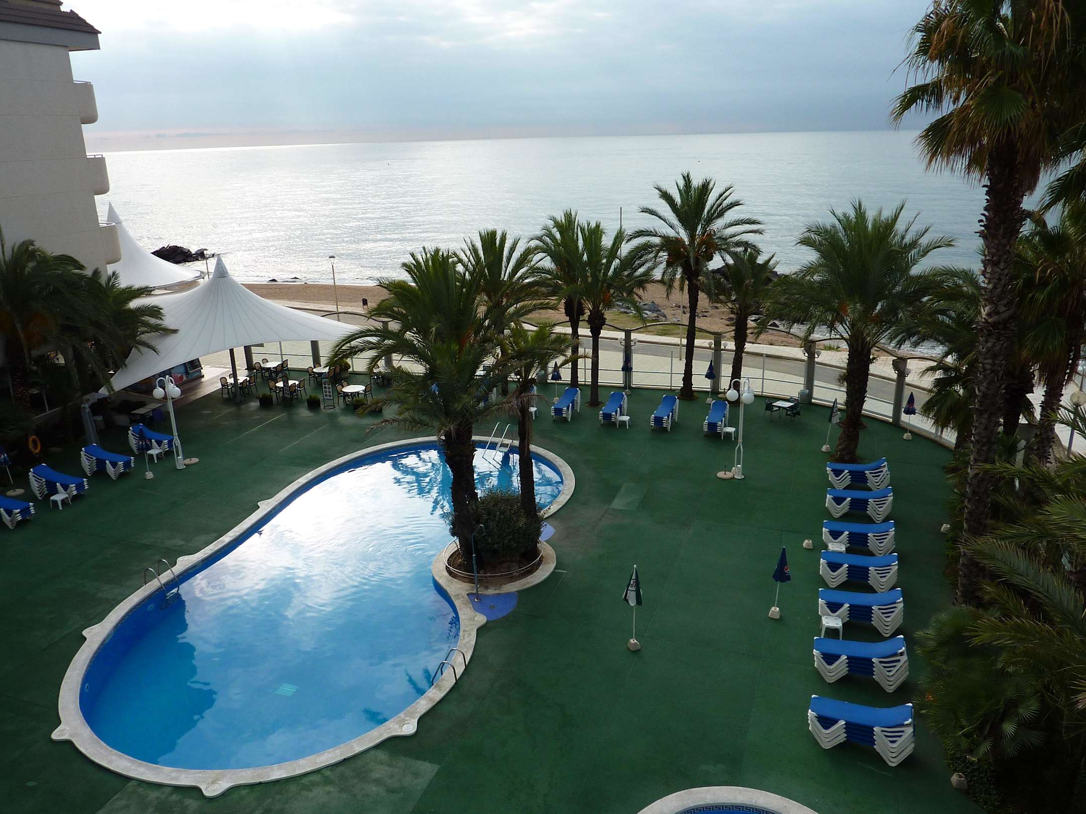 Blick auf Sonnenterrasse und Pool