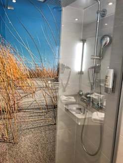 Bodentiefe Dusche mit Glaswand in angenehmer Tiefe.