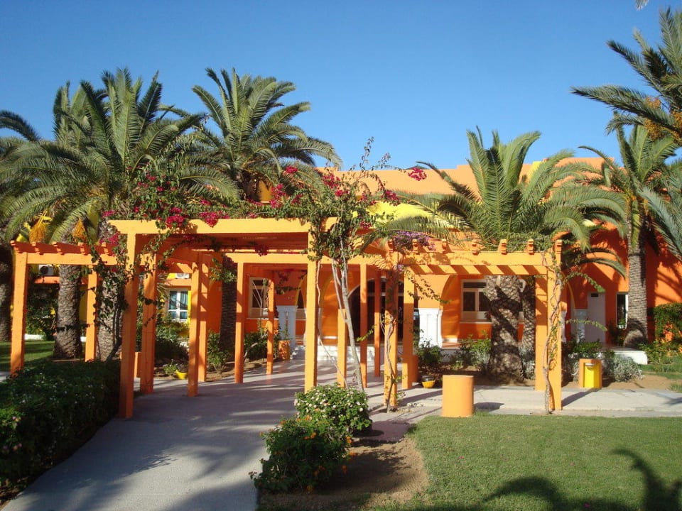 Außenansicht des Eingangsunter den vielen Palmen, die sich auf dem gesamten Gelände befinden, ist die Eingangshalle mit der Rezeption