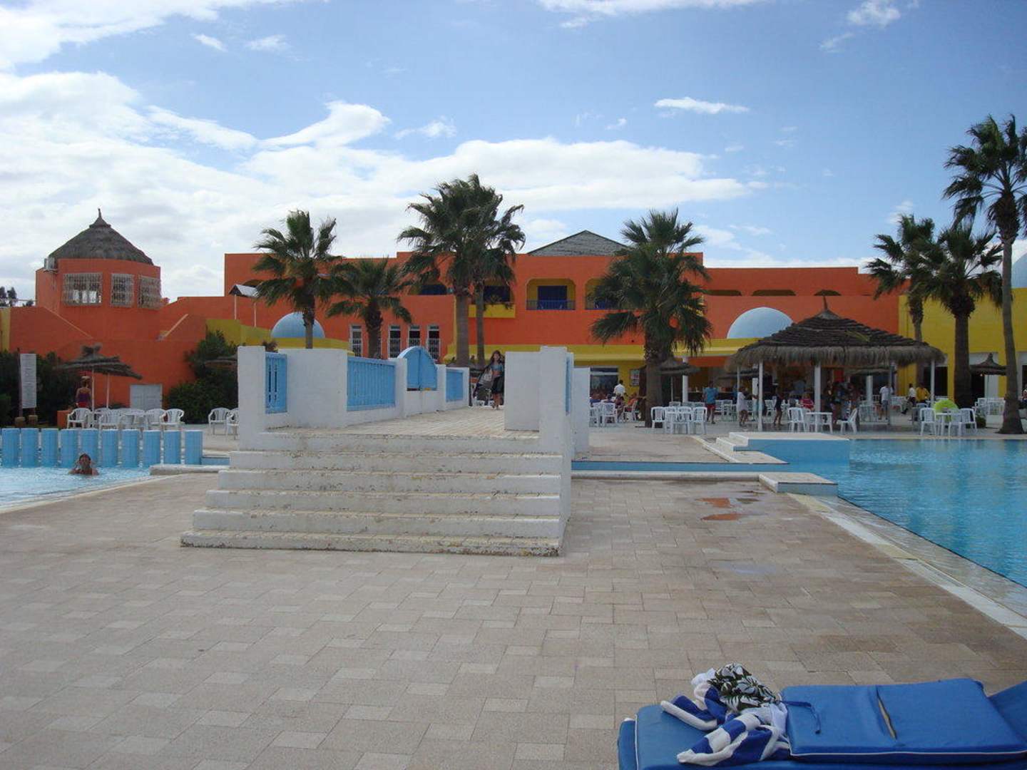 direkt hinter der Eingangshalle liegt der Pool und man hat einen Blick auf Meer. Der Pool ist nicht getrennt sondern geht unter der Brücke weiter.