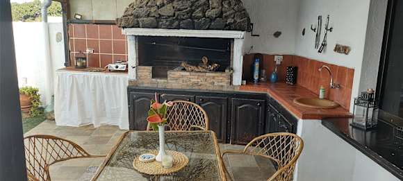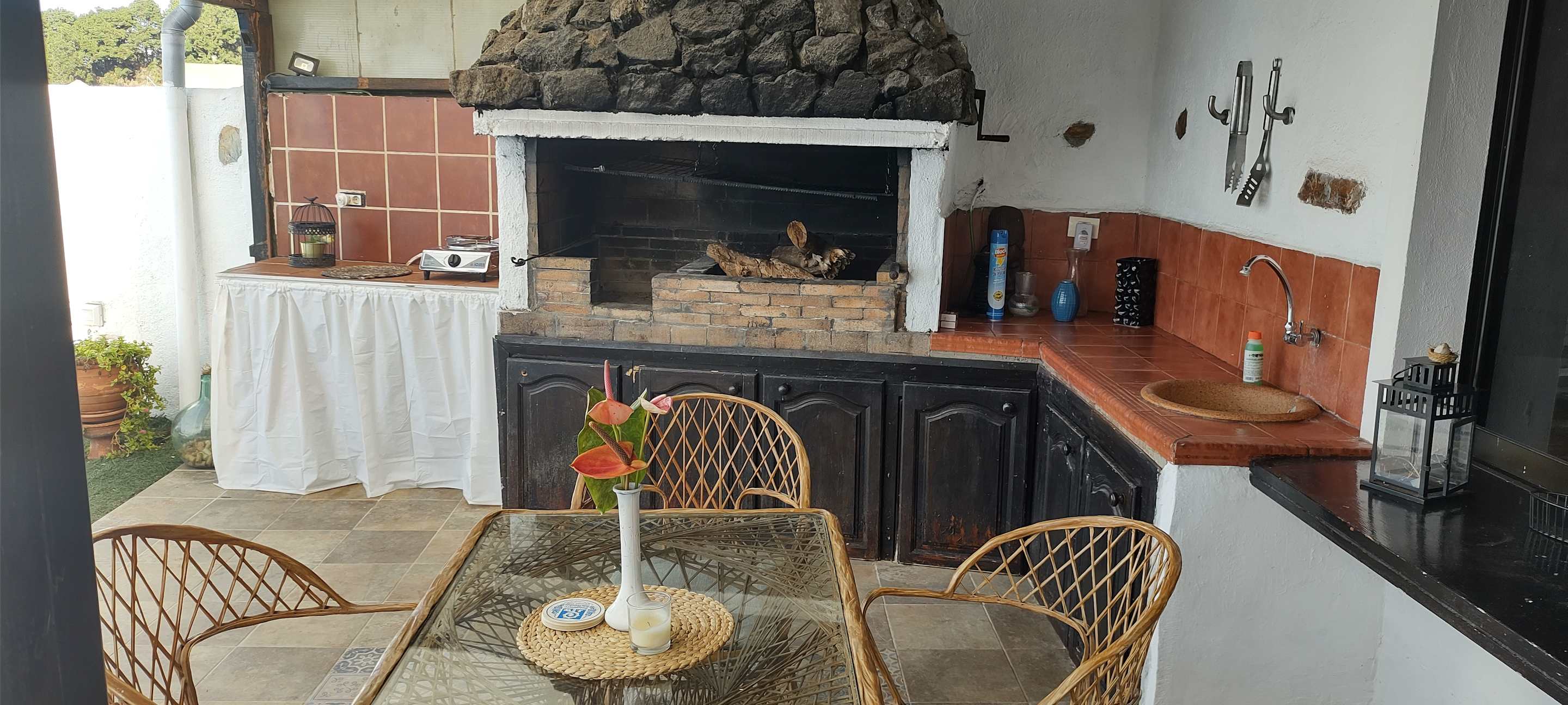 Die Terrasse mit großem Grill, Ablageflächen und einem kleinen Gaskocher nebenan. Man kann sowohl drinnen als auch draußen warme Mahlzeiten zubereiten.