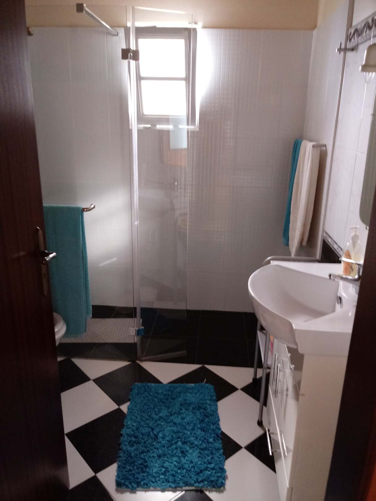 Bad mit großer ebenirdischer Dusche, Bidet, WC, Waschbecken und Handtuchheizung