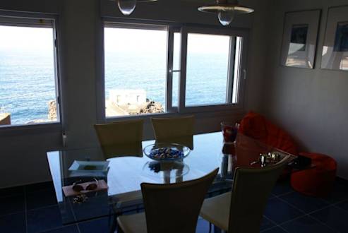 Blick vom Esszimmer hinaus über die Fensterfront auf's Meer!