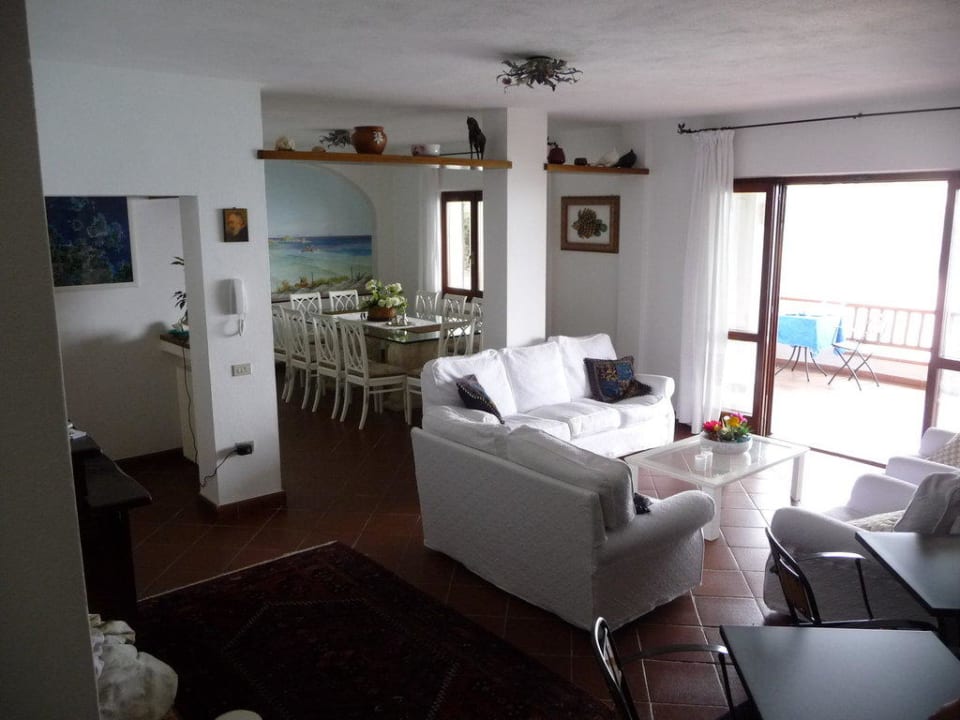 Der Aufenthalts-/Wohnraum mit angeschlossener Essecke in sehr geschmackvollem Design und Möbeln. Von hier aus hatte man einen wunderbaren Blick auf die Bucht Reina Bianca. Davor die Frühstücksterrasse.