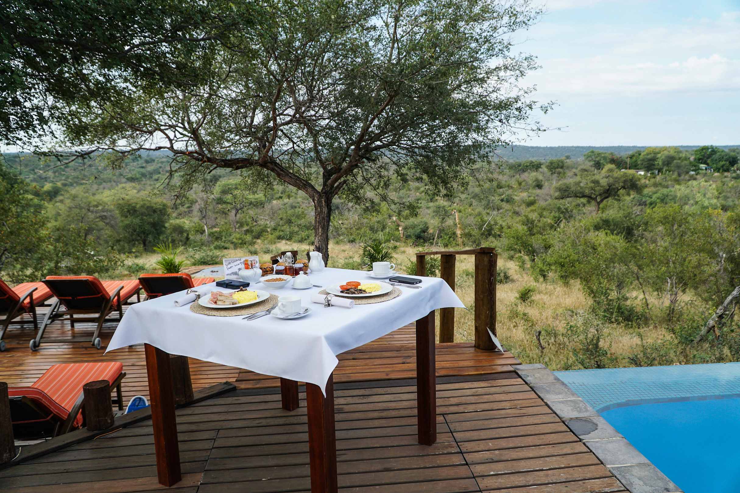Blick vom Pooldeck in den Busch (mit Giraffen im Hintergrund)