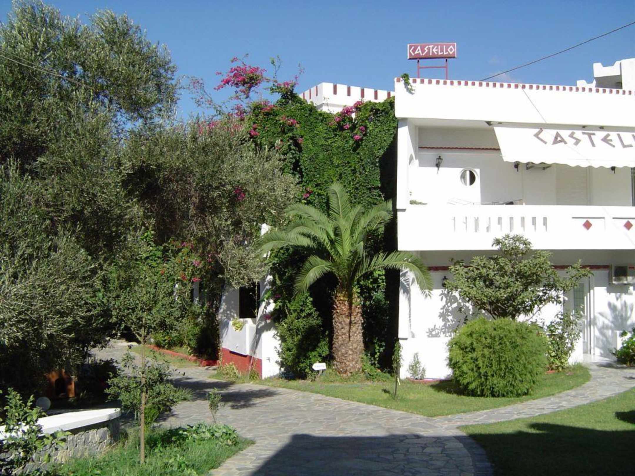 Die ist der Eingangbereich in den Garten des Hotel Castello, Plakias. Auf der Frontseite die zwei großen Appartements mit je 2 Schlafzimmern und großem Balkon bzw. Vorgarten.