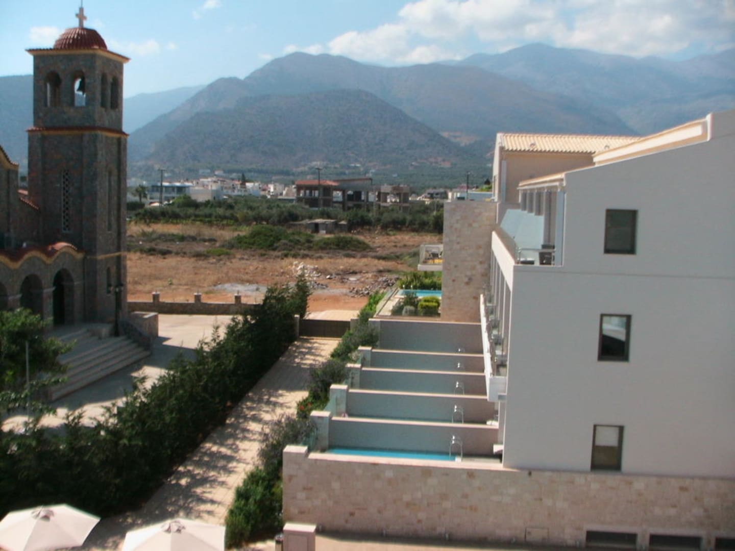 Blick auf die Privatpools landseitigDie Kirche vis a vis hört man nur Sonntags, wenn zur Messe geläutet wird.