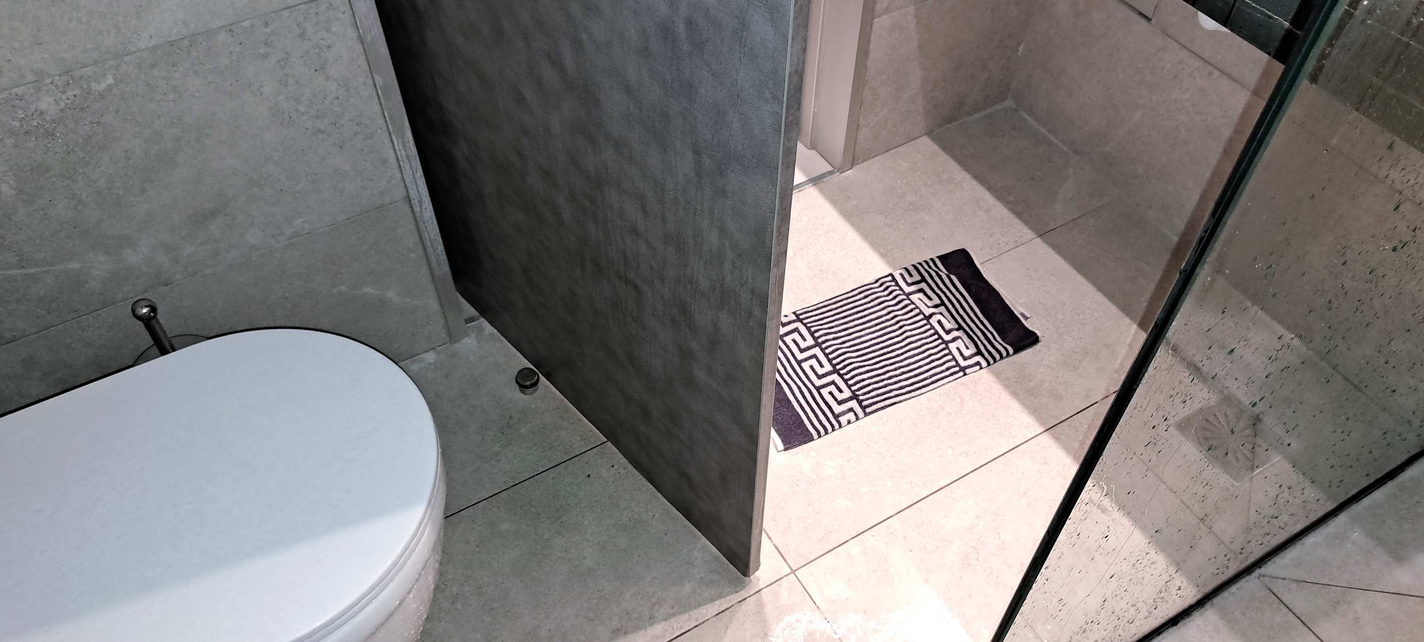 Im Badezimmer war der Durchgang zwischen der “Tür” und Duschkabinenglas nur ein paar Zentimetern breit. Um das Badezimmer zu betreten, musste man sich zwischen den beiden richtig reinquetschen.