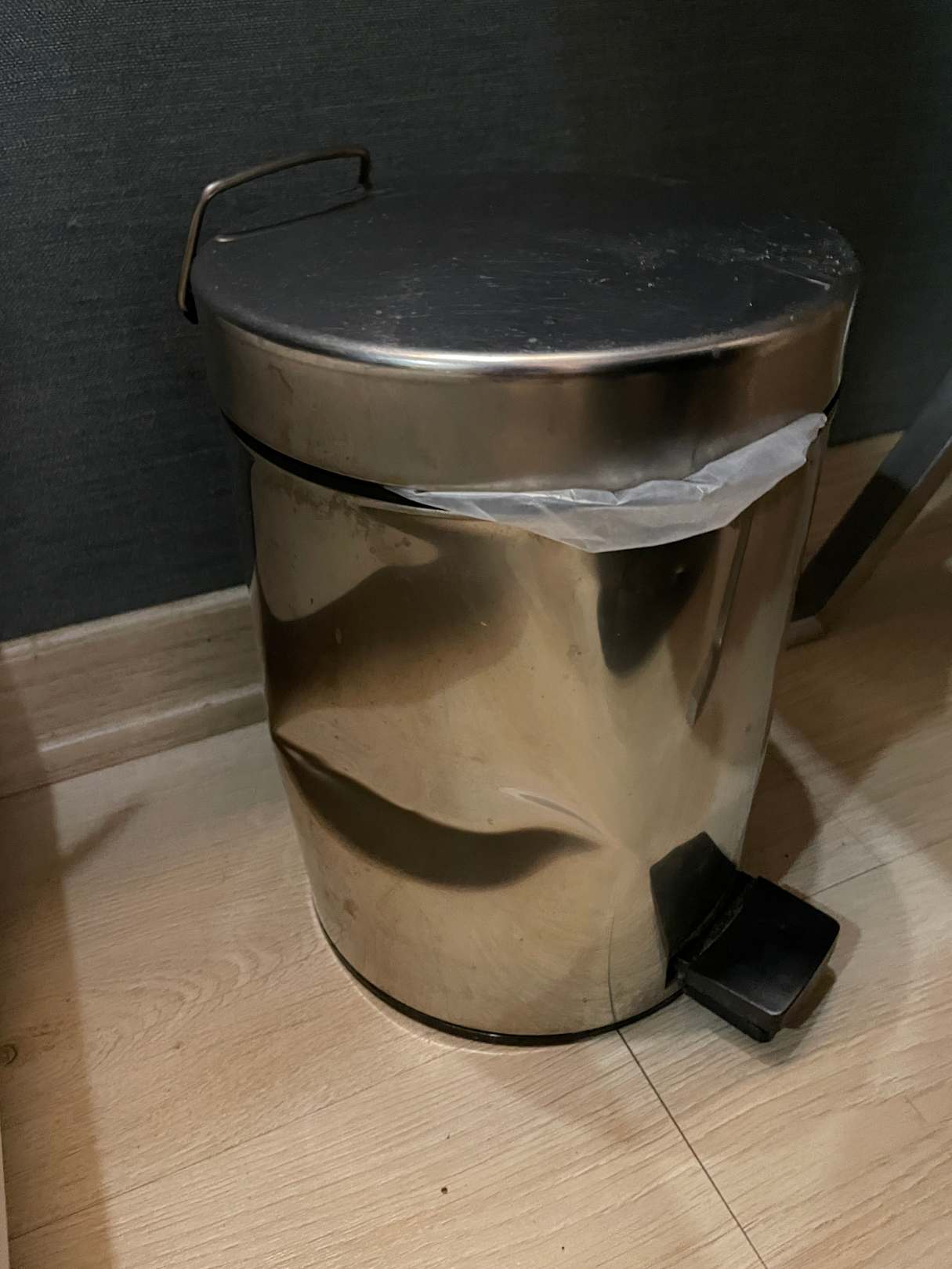 Kaputter Mülleimer im Zimmer. So einer wäre ja eigentlich günstig und fix ausgetauscht.