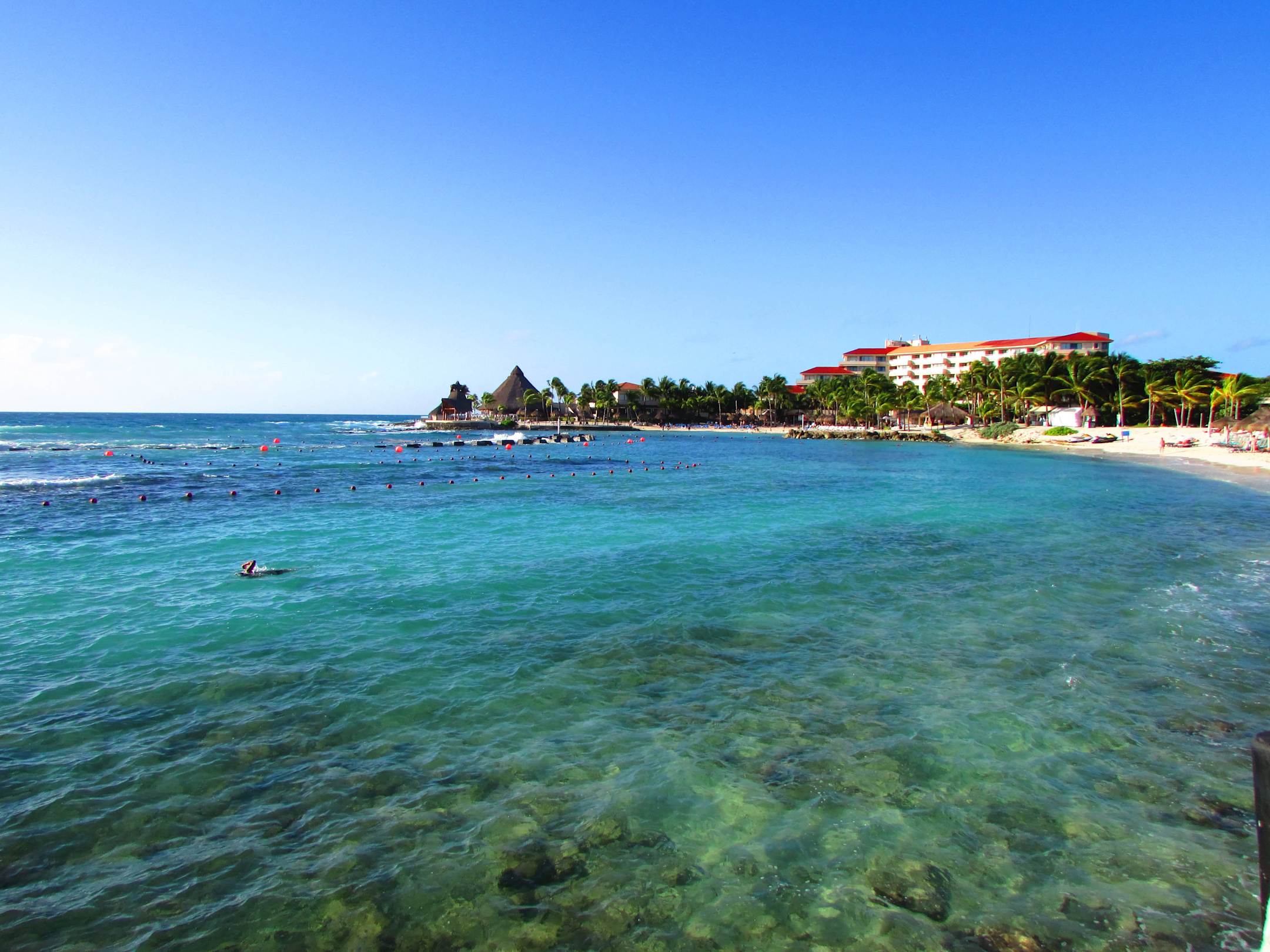 Strand, Felsenbarriere, Schwimmbereich (der hellblaue Streifen in der Bildmitte, Wasser ist dort hüthoch), danach wieder Felsenbarriere, danach Wellenbrecher, danach starke Brandung