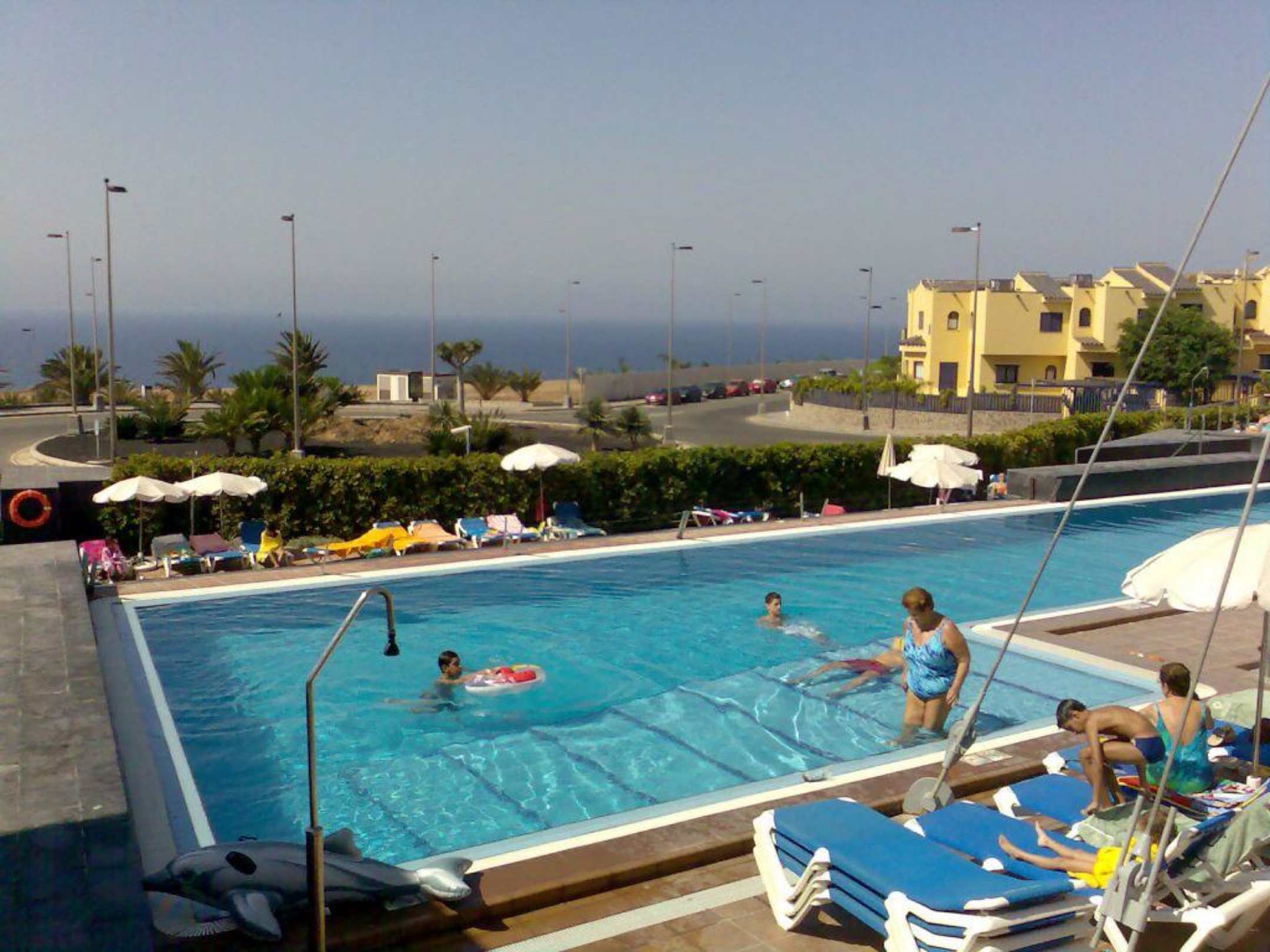 Blick von der Rezeption über den Pool zum Meer