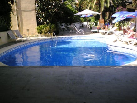 Blick über den Pool in den Garten des Celo Garden
