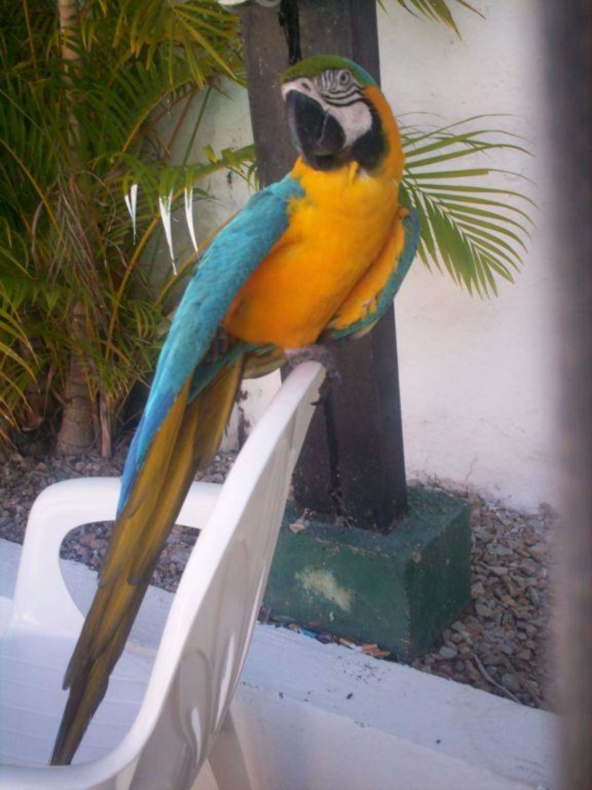 Dieser Papagei sagt Olá und läßt sich manchmal kraulen, oft aber hackt er auch nach den Zehen, wor allem, wenn sich jemand mit Fotoapparat nähert, Blitzlicht mag er nämlich nicht.