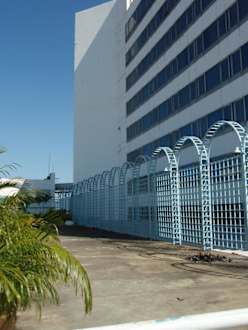 Blick vom Pool auf die Rückseite des Hotels