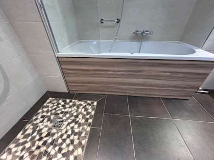 Bad - tolle, nicht abgedichtete Wannenverkleidung - hier wird man vom Schimmel begrüßt.