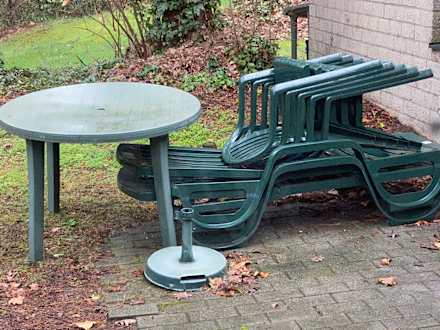 Verwittert. Eine Unterstellmöglichkeit für den Winter wäre für das Mobiliar sicher von Vorteil.