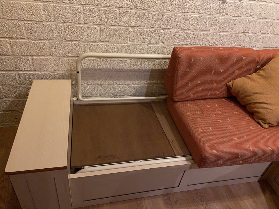 Die Couch wenn man mal genauer hin schaut (ich hab die zwei Kissen benötigt, um einen Turm zu bauen, damit meine Tochter nicht aus dem Bett fällt)