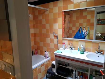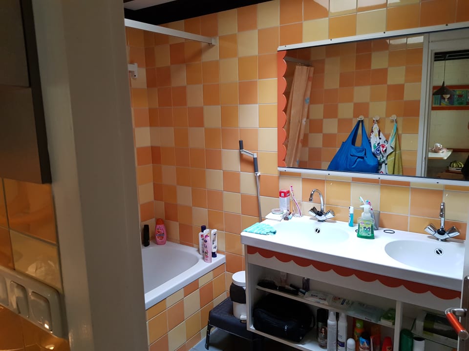 Badezimmer mit 2 Waschbecken und Wanne/Dusche