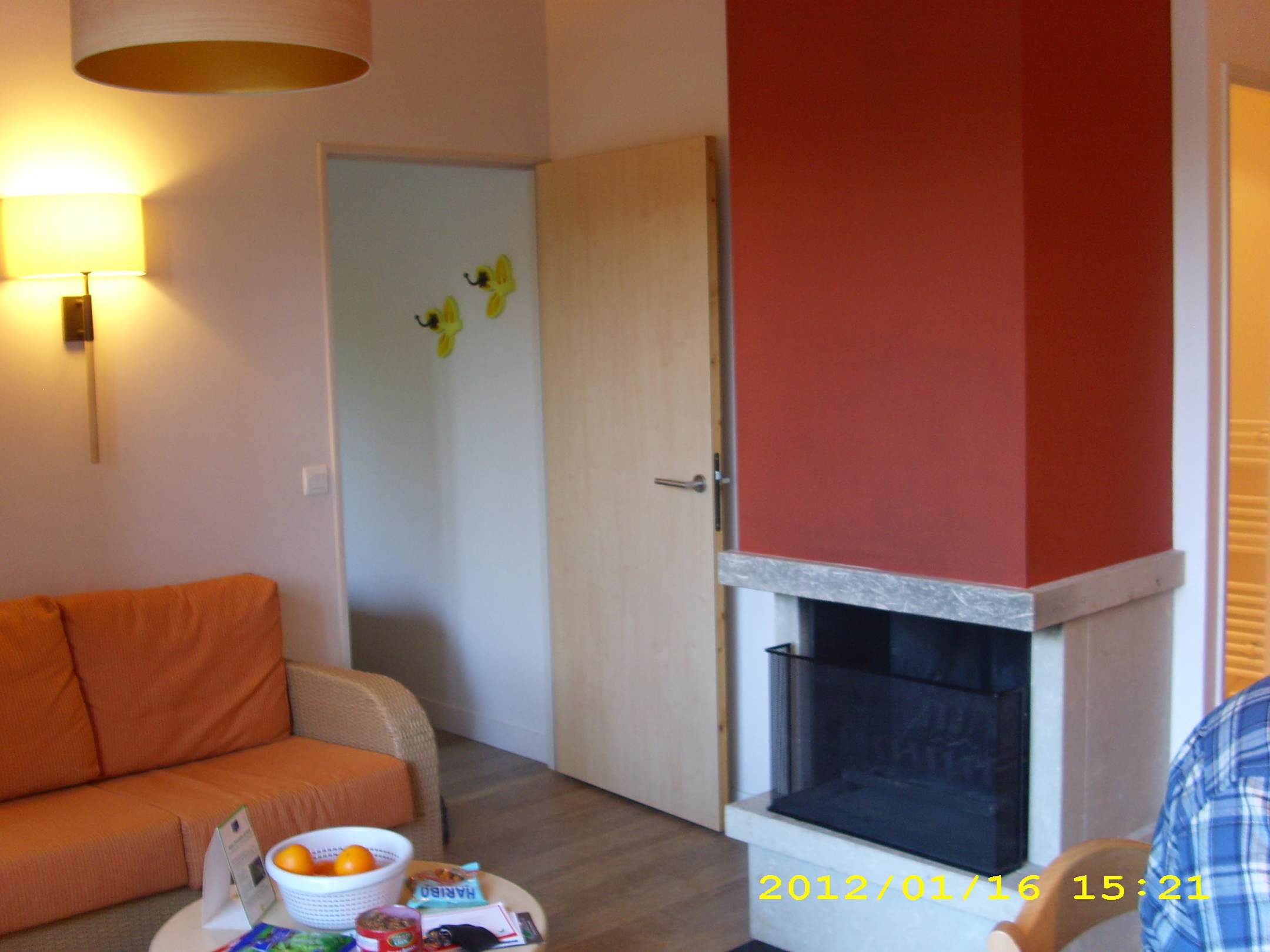 Wohnbereich mit Kamin und Zugang zum Schlafzimmer