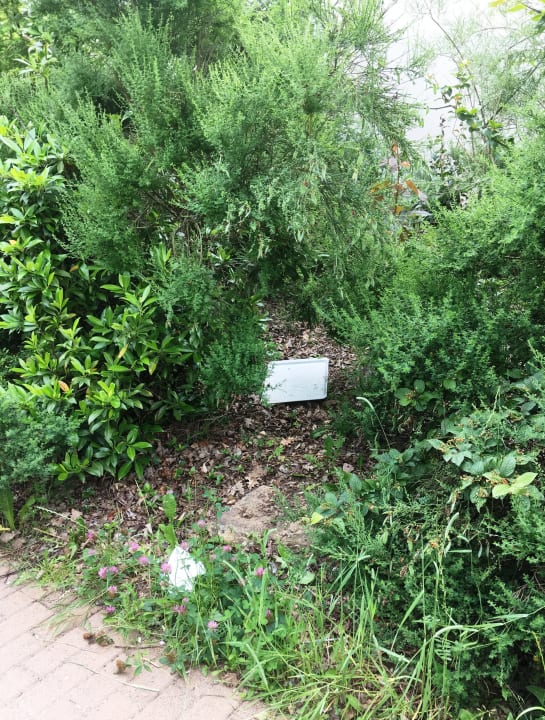 GartenanlageDieses Tablett lag 10 Tage, vom Geheweg aus gut ersichtlich, im Gebüsch. Hat scheinbar keinen Mitarbeiter interessiert...