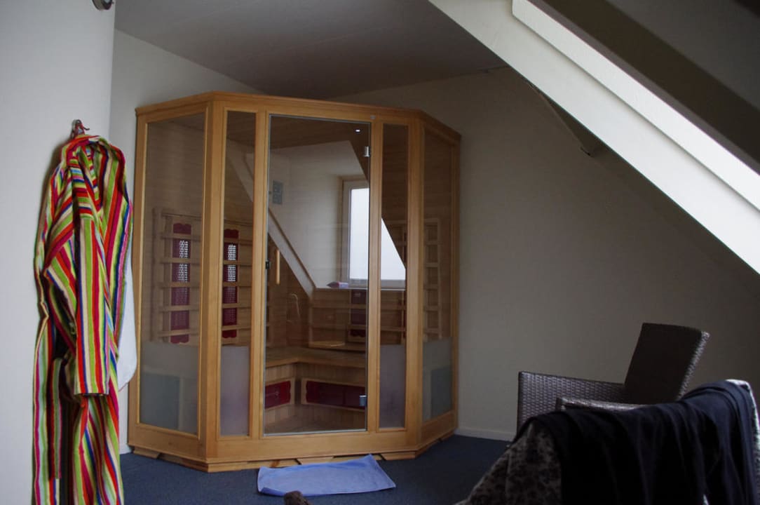 Ein großer Raum, in dem nur die Sauna und ein kleiner Tisch mit 2 Stühlen steht. Ideal um sich auszubreiten, gut für Kids und am Abend ein ruhiges Plätzchen für den Saunagang.