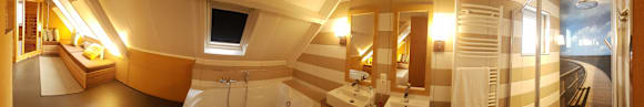 Badezimmer mit Regendusche, Whirlpoolwanne und Infrarotsauna