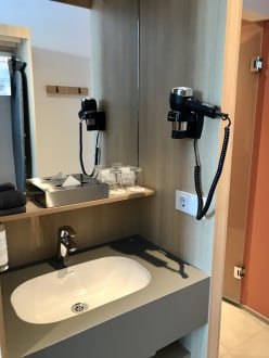 das Waschbecken ist im Zimmer, Dusche und Toilette separat