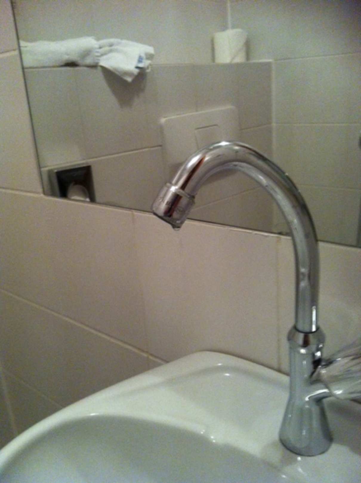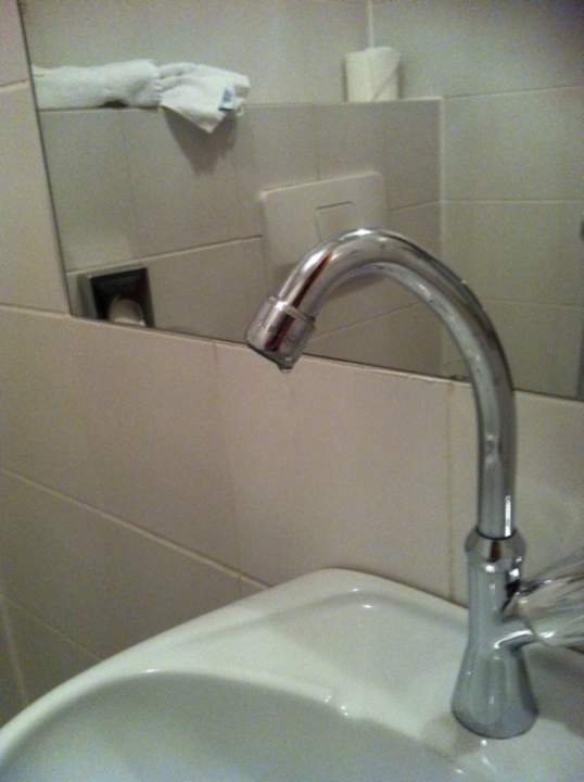 Alter, sehr schwergängiger Wasserhahn in einer Toilette, der dauerhaft tropfte.